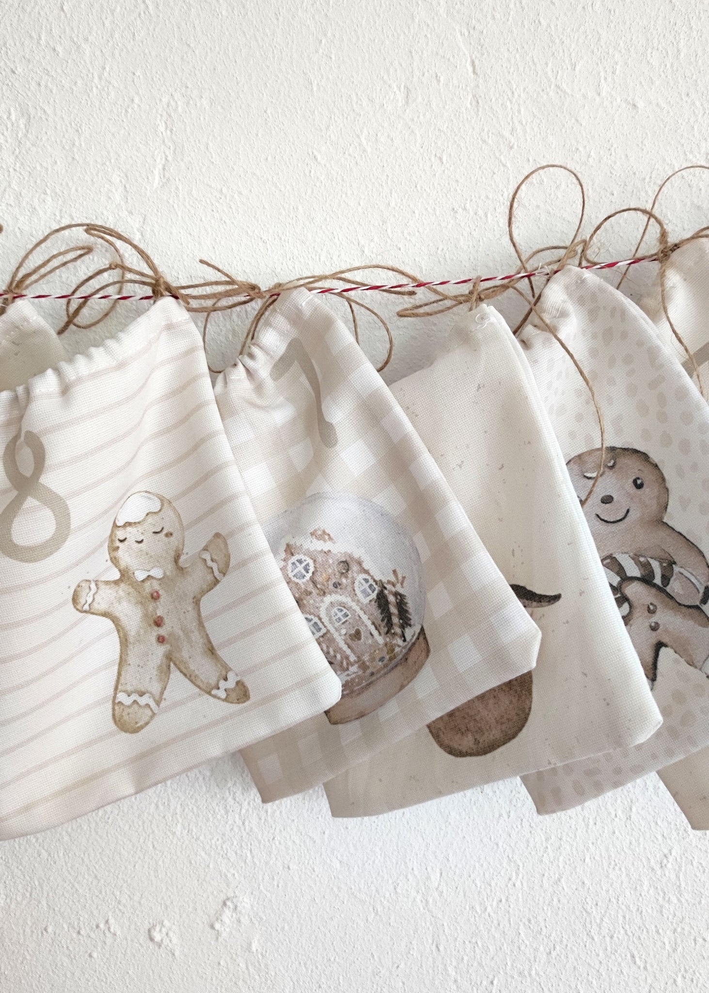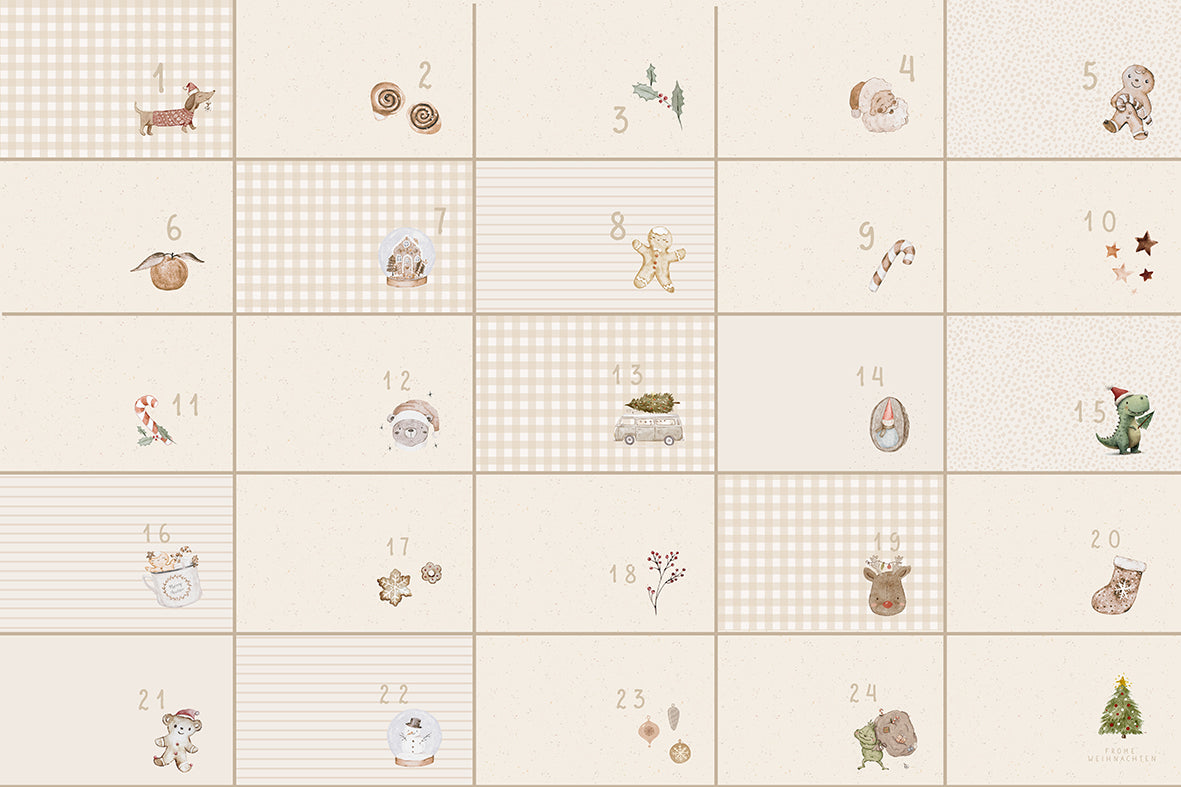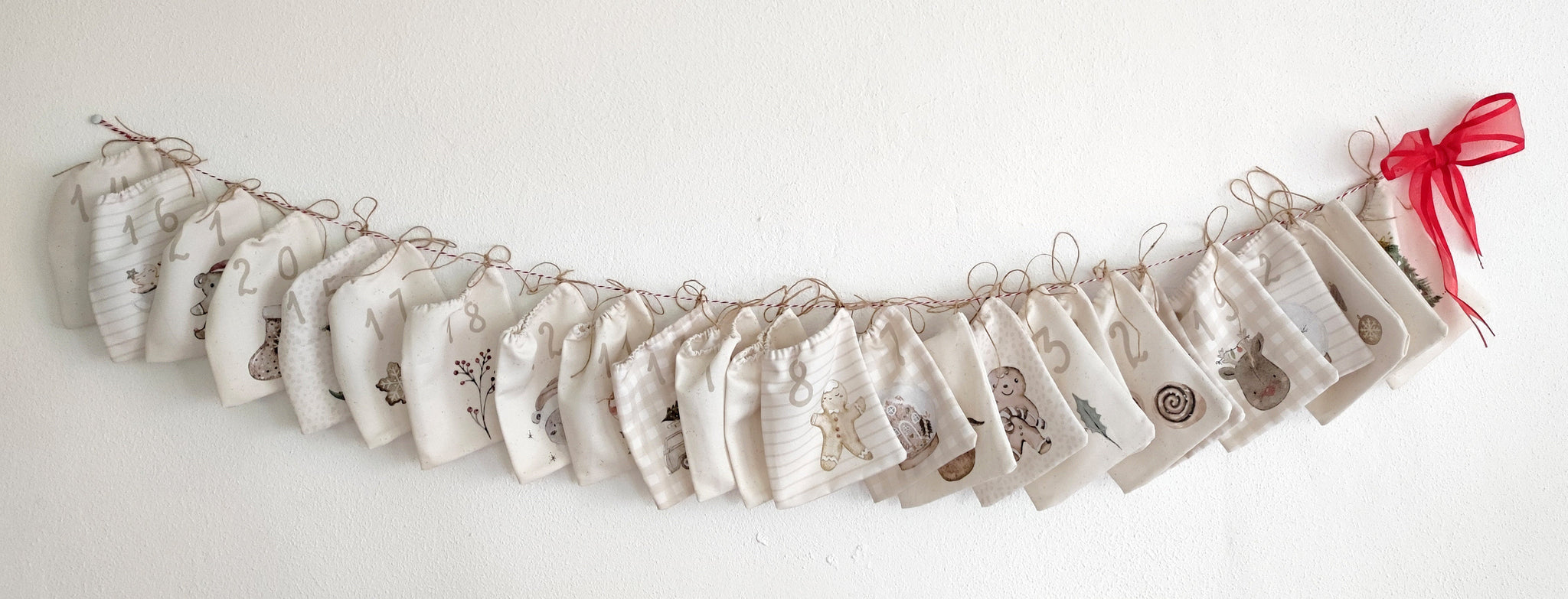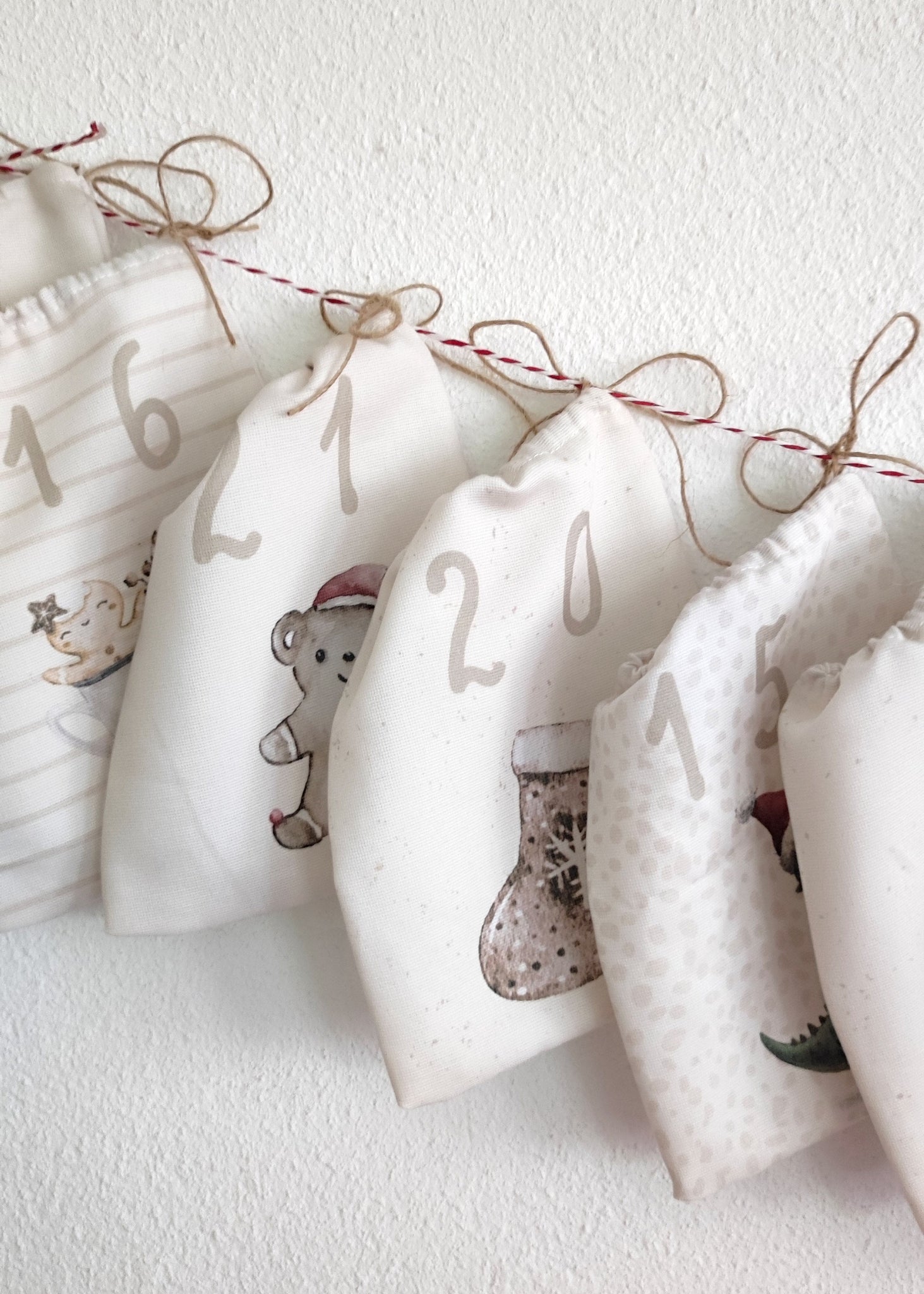 Ein schöner Adventskalender zum selber nähen mit beigem Hintergrund gemalt mit Aquarellfarben.