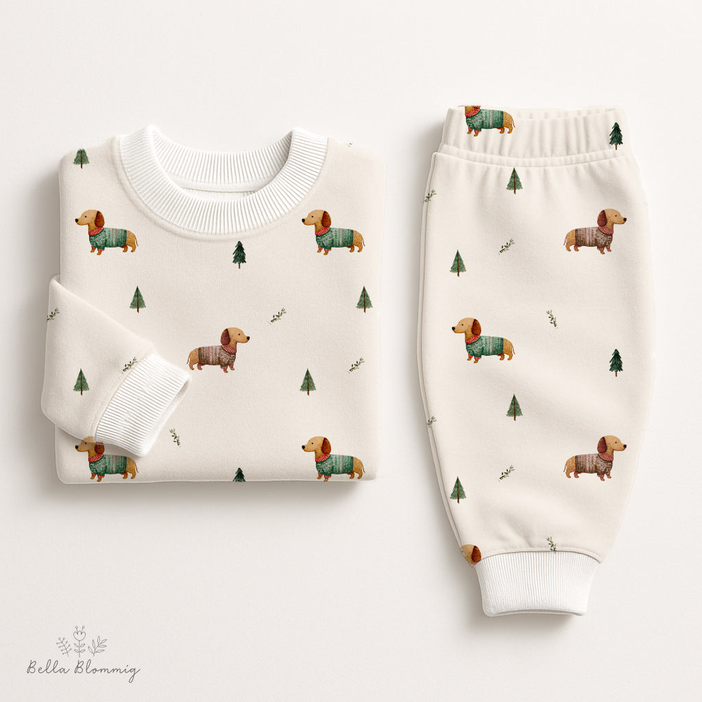 Ein Winter Dackel Design auf offwhite Hintergrund gemalt mit Aquarellfarben.
